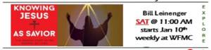 Knowing Jesus as Savior Every Saturday until March 7 11:00 am Current Discipiling GroupKnowing Jesus as Savior Open to all adults. Led by Bill Leinenger Here at WFMC every Saturday at 11 am in Room 7. Save the Date SHARE ON Twitter Facebook Buffer LinkedIn Pin It